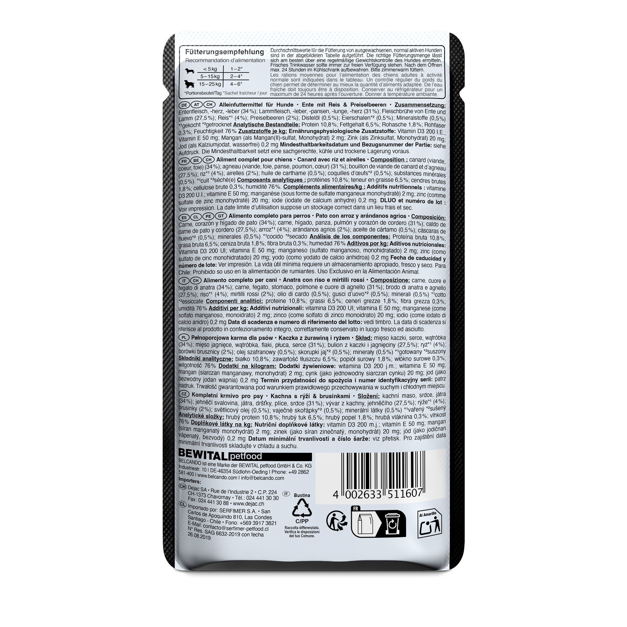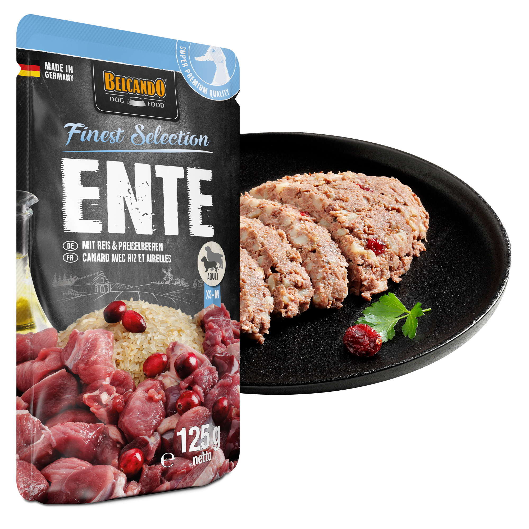 Wenn es schon kein frisches Fleisch gibt, dann muss es Belcando sein und hier wird Rind und Ente bevorzugt. Sehr gut vertragen und super praktisch die 125 gr Packungen, dann bleibt das Essen frisch und wenn es dann doch mal nicht schmeckt muss man nicht so viel wegschmeißen. Klare Kaufempfehlung!