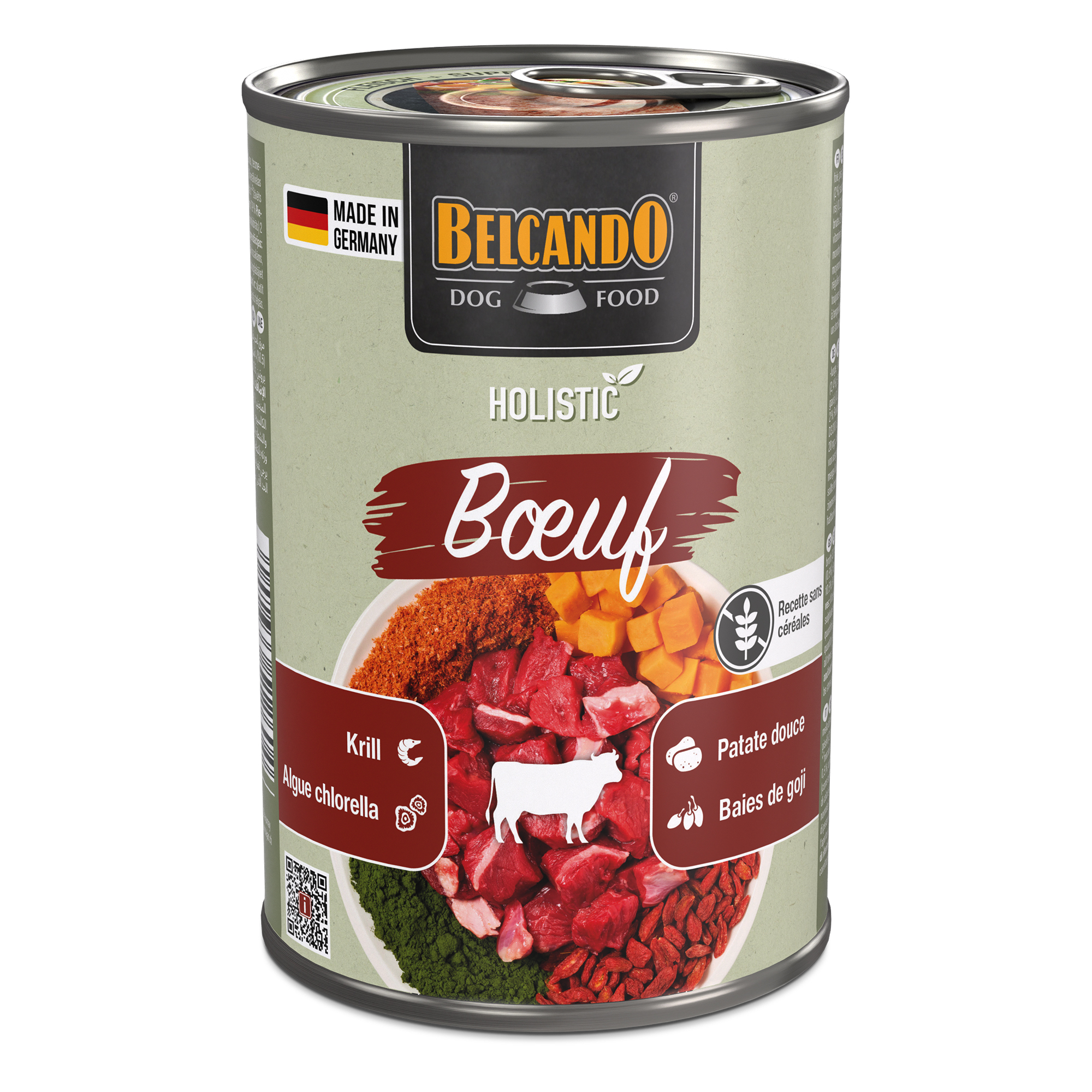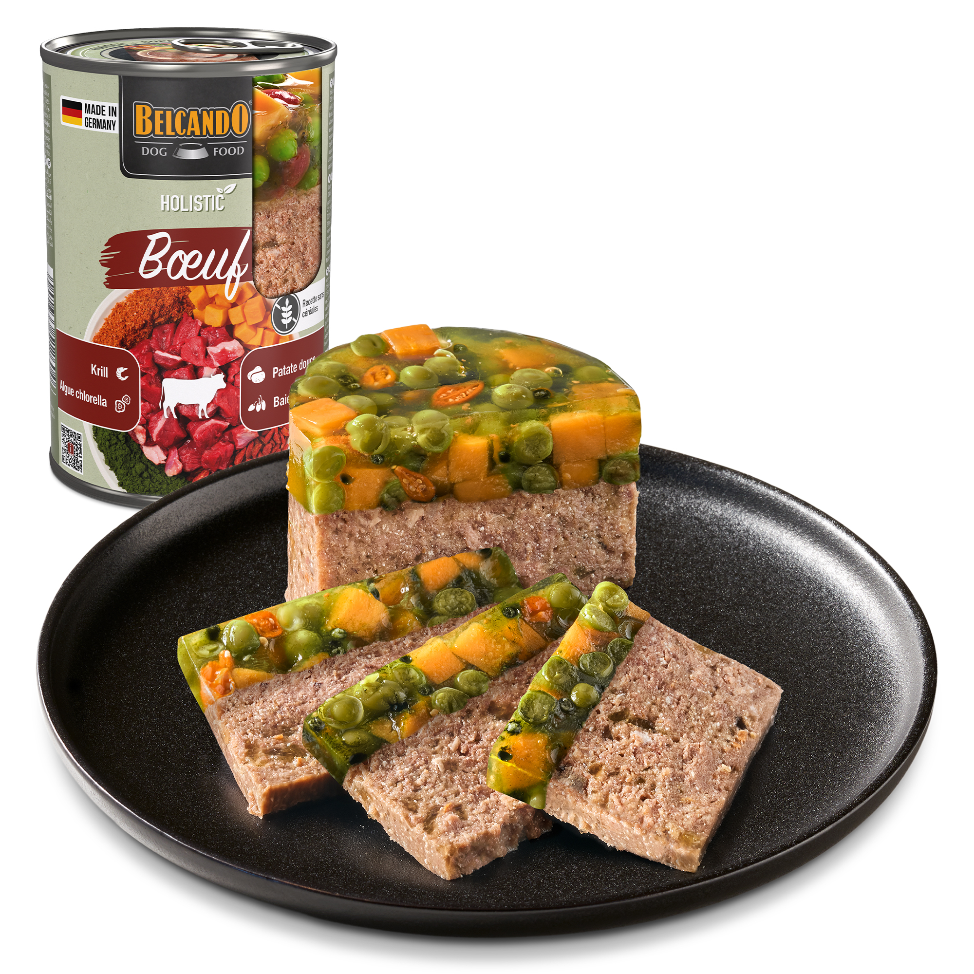 Composition bœuf (viande, cœur, poumon, foie, pis) (53 %); bouillon de viande de bœuf (37,4 %); patate douce (3 %); plancton de mer (krill)*¹ (2,4 %); pois (2 %); substances minérales (1,1 %); baies de goji*² (0,5 %); coquilles d’œufs*² (0,4 %); algues*² (Chlorella vulgaris) (0,2 %). *¹moulu *²séché(e)
