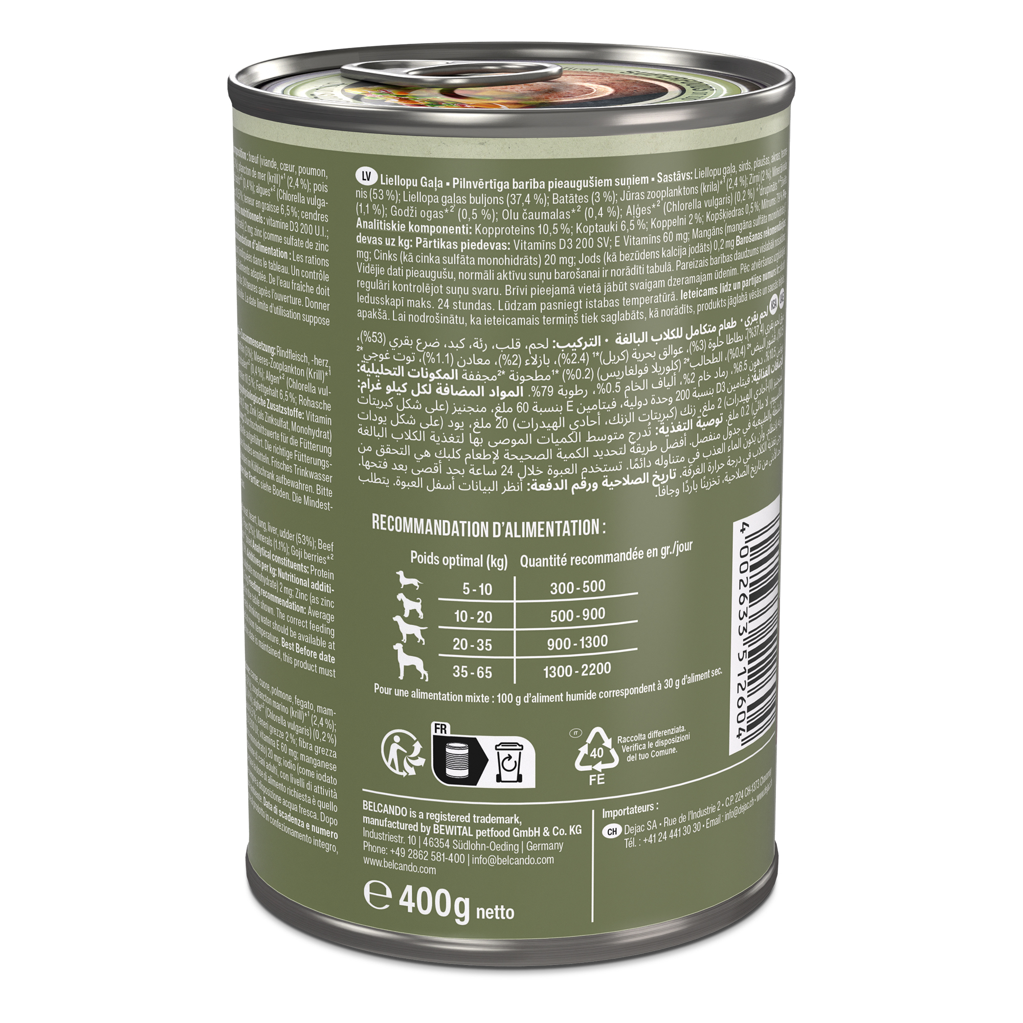 Les rations moyennes pour l’alimentation des chiens adultes à activité normale sont indiquées dans le tableau. Un contrôle régulier du poids du chien permet de déterminer au mieux la quantité d’aliments adaptée. De l’eau fraîche doit toujours être à disposition. Conserver au réfrigérateur pour un maximum de 24 heures après l’ouverture. Donner à température ambiante.