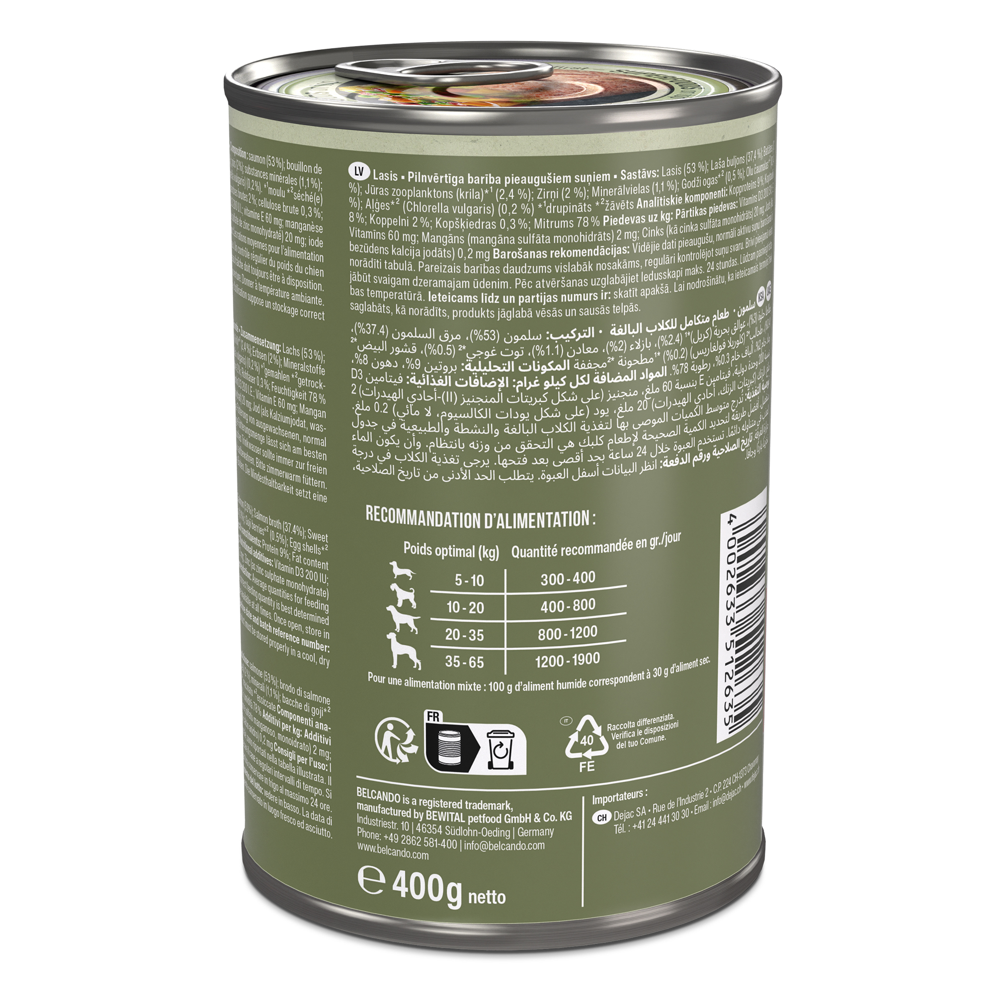 Les rations moyennes pour l’alimentation des chiens adultes à activité normale sont indiquées dans le tableau. Un contrôle régulier du poids du chien permet de déterminer au mieux la quantité d’aliments adaptée. De l’eau fraîche doit toujours être à disposition. Conserver au réfrigérateur pour un maximum de 24 heures après l’ouverture. Donner à température ambiante.