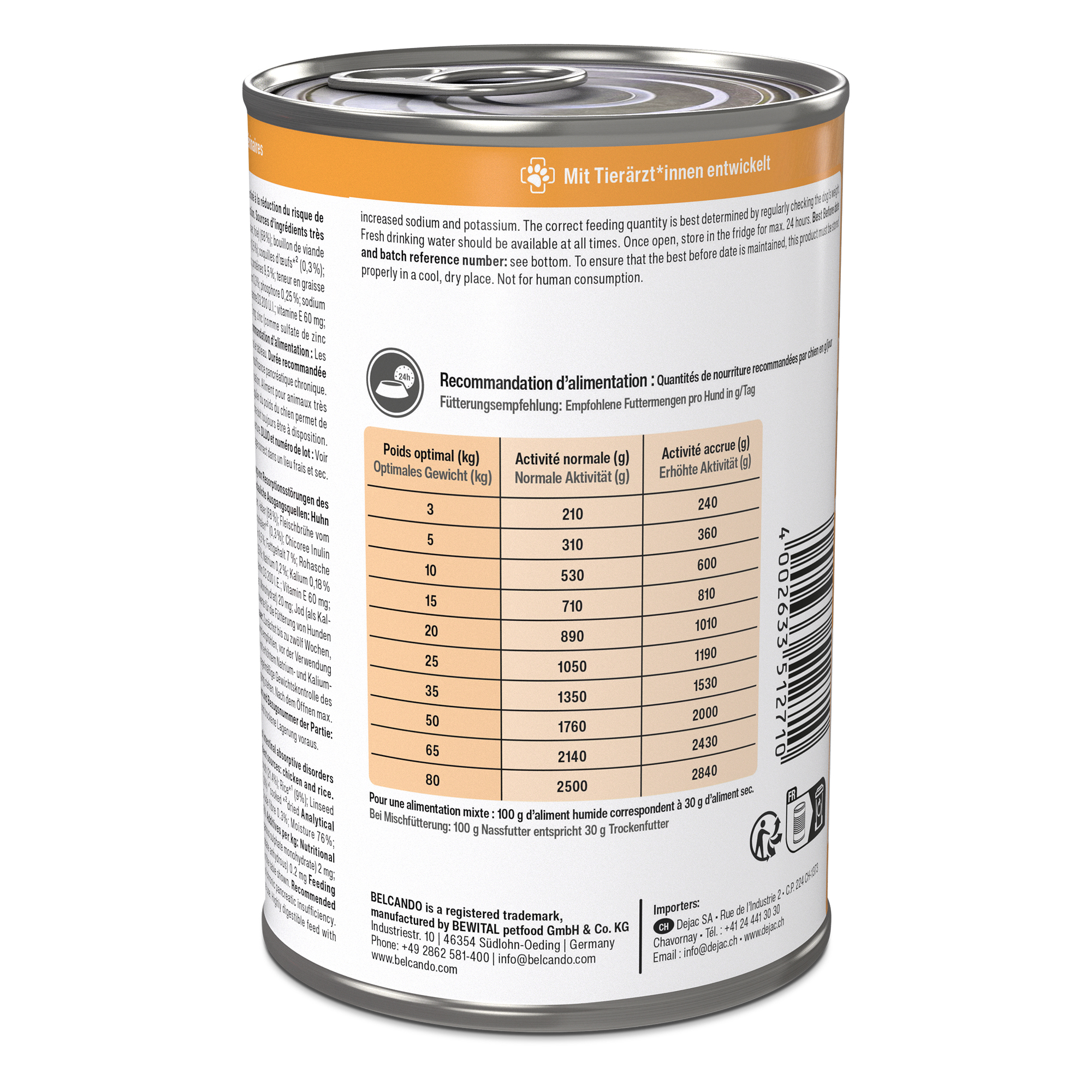 Les rations moyennes pour l’alimentation des chiens sont indiquées dans le tableau. Durée recommandée de l’alimentation : Au départ, jusqu’à 12 semaines et à vie en cas d’insuffisance pancréatique chronique. Il est recommandé de demander l’avis d’un vétérinaire avant utilisation. Aliment pour animaux très digestible à teneur accrue en sodium et potassium. Un contrôle régulier du poids du chien permet de déterminer au mieux la quantité d’aliments adaptée. De l’eau fraîche doit toujours être à disposition. Conserver au réfrigérateur pour un maximum de 24 heures après l’ouverture.